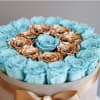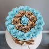An opulent ring of shimmering gold roses encircles preserved aqua blooms, crowned with a central rose. This 3 or more years lasting arrangement in a champagne velvet hatbox exudes grandeur and modern elegance.
