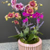 Group of mini orchids in pink ceramic dish