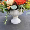 Urn ceramic vase fill with beautiful fall seasonal flowers , roses , orchids, mums , gourds, fillers and eucalyptus.