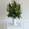 This elegant arrangement features soft blush and pink blooms including roses, lilies, hydrangea, and seasonal accent flowers, thoughtfully layered with lush greenery for a natural, uplifting presence. Designed in a classic white urn, this piece is ideal for funeral services, memorials, or celebration-of-life ceremonies.