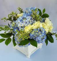 Reproduction Blue and White Cachepot with display base filled with Blue Hydrangeas - a classically elegant selection for your order. Selection of containers varies, your order will be filled to value with current inventory.. CALL 912.638.7323 TO DISCUSS OPTIONS!