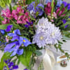 This arrangement is a breath of fresh air, designed wide and wild with effortless garden style. Flowing shades of blue take center stage, created by elegant iris and airy delphinium, while statice deepens the palette with its rich blue accents. Fresh green bells of Ireland add height and texture, and a soft pop of purple alstroemeria brings balance and charm. Finished with lush mixed greenery, including fragrant eucalyptus, this design feels organic, free-spirited, and beautifully untamed—perfect for making a relaxed yet striking statement.