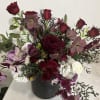 A designer's choice arrangement focusing on red roses accented with seasonal high-end flowers in reds, pinks, whites, and purples presented in a ceramic vessel.