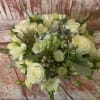Floral arrangement in elegant white and cream hues presented in a clear glass or ceramic vessel.