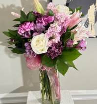 Mixed pink blooms in a clear glass vase