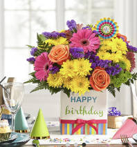 Make a wish! Instead of a calorie-packed cake, send the birthday star a birthday cake of flowers. This unique arrangement features happy shades of pink, purple and white. And no birthday cake's complete without candles!