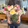 A soft, blush arrangement in pinks and cream featuring roses, lisianthus, mini lime hydrangeas, and sweetheart roses. Leonie comes beautifully gathered in an elegant glass book vase.