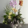 The centerpiece features multiple Phalaenopsis orchids in soft pink, warm peach, and buttery yellow tones, each bloom delicately layered with subtle gradients and intricate centers. Their tall, graceful stems add height and movement, creating a striking vertical element.