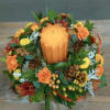 A table wreath wrapping a large candle with local fauna and thoughtful blooms. Sophisticated and Elegant.