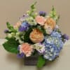a delicate arrangement, soft peaches and blues in a twig based basket. Straight out of a walk in the woods.