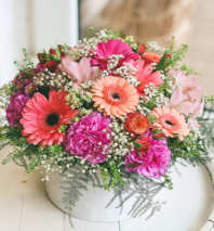 Introducing our captivating pastel floral arrangement, a stunning combination of Ranunculus, Dahlias, Roses, Lisianthus, Stock, Japanese Spray Roses and Eucalyptus. This enchanting arrangement is designed to evoke a sense of beauty, harmony, and grace, making it a perfect choice for any occasion.