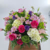 Elevate your space with our modern floral arrangement in a brown 7"x7" wooden box. The striking mix of hot pink roses, purple lisianthus, green trick, mini green hydrangea, pink alstroemeria, green buttons, and assorted greenery creates a captivating display. This arrangement exudes contemporary elegance, making it the perfect centerpiece to add a touch of sophistication and style to any setting.