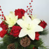 Get in the holiday spirit with this festive centerpiece! This arrangement includes bright red carnations and roses, white Casa Blanca lilies, pine cones, and an assortment of fresh-smelling winter greenery. Minimal Christmas decor and a hand-tied bow is added to complete the look. The centerpiece is placed inside a red tinted glass vase for a classic winter feel.