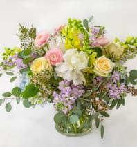 A custom designed arrangement by Fairbanks Florist. A beautiful collection of mixed seasonal flowers that are fresh in our shop the day of delivery. We try our best to design something similar to what is pictured, but our shop does custom design - so each arrangement is a little different, but has the same spirit, beauty and freshness.