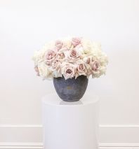 Arrangement placed in a seat vase with beautiful lilac, playa Blanca roses and greenery.