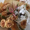 Caramel-toned roses, airy cotton stems, cascading amaranthus, and architectural foliage create layered depth and movement.