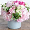 It's filled with premium flowers: white hydrangea, light pink hydrangea, roses, and all arranged in a beautiful vase.