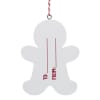 The ornaments include: gingerbread man, gingerbread girl, stocking, snowman, Santa, and reindeer. Has bakers twine hangers on the ornaments, made of wood.