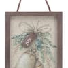 Wooden framed canvas ornament assortment in two designs. One has a Christmas Tree with a "Merry" wooden tag attachment. The other has bells with a "Joy" wooden tag attachment.