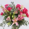 Flamingo is a fun pink arrangement that features Pink Asiatic Lilies, Pink Snapdragon, Hot Pink Roses, Hot Pink Carnations, Hot Pink Mini Carnations and Mixed foliage arranged in a tall clear glass vase.