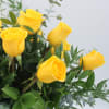 A Classic one dozen Ecuadorian Long Stem Yellow Roses with Ruscus and Eucalyptus and a taller clear glass vase.