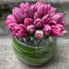 The tulips are presented in a clear glass bubble bowl that is lined with bear grass and a layer of pebbles or colored composition. Varieties will vary depending on what is in bloom making each Tulip Bowl a highlight of the richness of specialty tulips at their seasonal best.