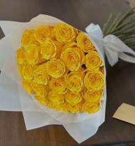Bouquet of yellow deysis and white lilies, the color of the paper may vary depending on availability.