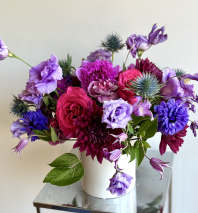 Gorgeous, lush garden-styled flower centerpiece in warm pastel colors arranged in a ceramic vase, featuring premium flowers such as roses, ranunculus, clematis, lisianthus, stock, astilbe, delphinium and more. Choice of flowers may vary based on the availability.