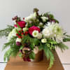 Lovely flower arrangement in a shiny cylinder vase with a variety of winter greens and premium fresh flowers in a festive holiday color palette. Roses, ranunculus, berries, amaryllis, anemone, lisianthus, gerber daiseis, hellebore and more, based on availability.