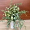 A tall fragrant holiday flower arrangement with lots of wintergreens, eucalyptus, white star astrantia and white hypericum berries. An organic clean simple, yet elegant looking, long lasting fresh flower centerpiece will be a lovely addition to your cozy home or office for holidays.