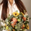 Designed with a light, natural mix of sunflowers, seasonal roses, two varieties of eucalyptus, and textured greenery all arranged without paper wrapping.