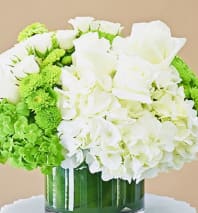 This uplifting Mother's Day, fresh spring filled design is our signature, sure to delight its recipient. Light and airy with Hydrangea, Tulips, spring bulb flowers and assortment of filler flowers designed in a glass cylinder or Globe vessel