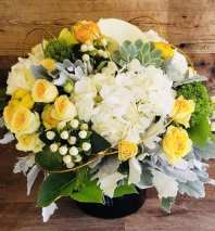 Organic, Summer time design with Sunflowers, Hydrangea, Lisianthus, Scabiosa, and Eucalyptus. Designed in a Galvanized round container. * Please note these are seasonal flowers and may not be available depending on the time of year. We always do our best to create a similar aesthetic.