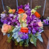 This arrangement is a new design using peaches, oranges and purples. The foliage adds a delicate touch with grey undertones.