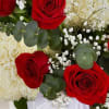 Standing cross arrangement of white football mums and red roses; accented with soft, lush greenery