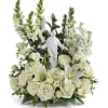 An elegant display of faith and grace, this beautiful arrangement will comfort the bereaved in a truly thoughtful and respectful way. An exquisite sculpture of Jesus is surrounded by a bed of lovely blossoms. It is sure to be appreciated and always remembered.
