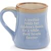 Hand-painted blue porcelain mug with a slight taupe rim. In the center of the mug, raised "Mom" message in a taupe circle. Interior is taupe and handle is blue. Individually gift boxed.
