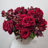 Ignite romance and sophistication with our Ruby Velvet Arrangement. This stunning, monochromatic masterpiece features a lush gathering of premium long-stemmed red roses, velvety spray roses, and exotic deep burgundy Cymbidium orchids.