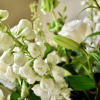 "Graceful Wishes" features all white roses, bells of Ireland, and stock on a bed of vibrant foliage.