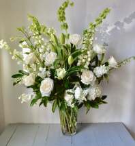 The design comes in a glass vase and features blue delphinium, and white roses, as well as seasonally available white flowers.