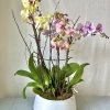 An elegant display of orchids, includes 3 orchid plants, each with a minimum of 2 stalks, in a premium, modern ceramic vase.