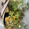 Bright, garden-fresh design: a hand-tied flower arrangement perfect as a cheerful birthday bouquet or a "just because" gift that feels freshly picked from the greenhouse. The mix of yellow ranunculus and small white daisy-like blooms creates an uplifting, sunny impression, while green protea-style heads and cymbidium orchid blossoms with burgundy centers add unexpected texture and an exotic touch. This arrangement reads as both celebratory and relaxed-the kind of bouquet that makes the person you're thinking of feel noticed and genuinely delighted.