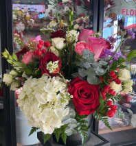This amazing arrangement is a perfect way to star your Valentine’s day , made of roses ,sunflowers ,lillies,and all of the greens that giving a plus