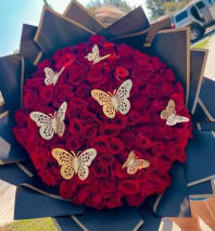 Arreglo con rosas rojas, naranja, amarillas y rosita, alstroemeria, lirios rosa con pompones verdes. Adornos de Mariposas verdes.