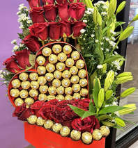 beautiful heart bouquet with chocolates an red roses