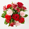 Carnations, roses, alstroemeria, assorted greenery, arranged in a clear glass vase.