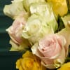 25 premium roses in the colors of yellow, pink, and white, carefully arranged to create a striking and harmonious display.