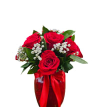 A lush dome of deep red roses creates an immediate, velvety impression-perfect as a romantic bouquet or anniversary roses that say "I adore you" without words. This large red rose arrangement also makes a bold statement for special moments like Valentine's Day, a milestone birthday, or a dramatic centerpiece for holiday and memorial occasions; the black wrap and ribbon add a formal, luxurious contrast that heightens the emotion for Father's Day, Christmas, or a thoughtful "I'm sorry."