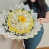 Las 36 rosas blancas simbolizan la pureza y la inocencia, añadiendo un toque de serenidad y elegancia al ramo. Las rosas amarillas, con su cálida luminosidad, representan la alegría y la felicidad, infundiendo al ramo una energía contagiosa y optimismo. Completando esta magnífica composición, los girasoles irradian calidez y vitalidad, evocando la luz dorada del sol y transmitiendo una sensación de positividad y renovación.