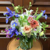 This Spring Garden has soft color garden roses (depending on availability), Kale, Seasonal Ranunculus, Bright Blue Iris, Lilies, Hydrangaes, and Stock in a grand round crystal vase.